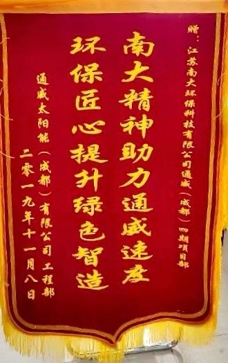 近日,江蘇南大環(huán)保科技有限公司收到通威太陽(yáng)能(成都)有限公司的錦旗和表彰信,南大環(huán)保在年產(chǎn)3.8GW高效晶體硅太陽(yáng)能電池互聯(lián)工廠建設(shè)項(xiàng)目中,面對(duì)困難勇于擔(dān)當(dāng),全力攻克,為保障業(yè)主生產(chǎn)調(diào)試廢水出水任務(wù)做出突出貢獻(xiàn)。